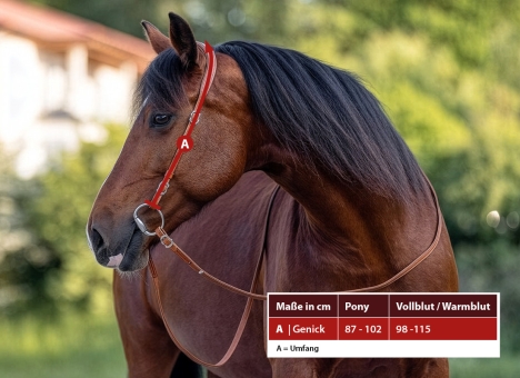 Das minimalistische Kopfstück verfügt über ein anatomisch geschnittenes und weich gepolstertes Genickstück. Die Lederbreite von 14 mm sowie die zarten Barockschnallen mit einer Größe von 2,7 x 3,5 cm sehen auch an feinen Köpfen sehr edel aus. Das Genickstück ist mit handschuhweichem Elchleder unterlegt.